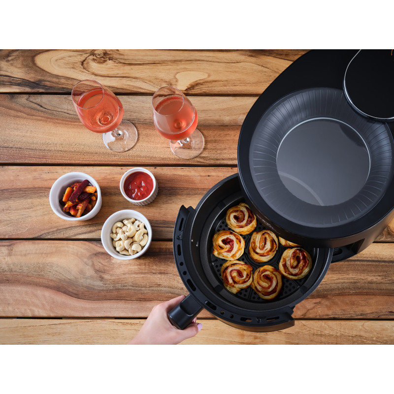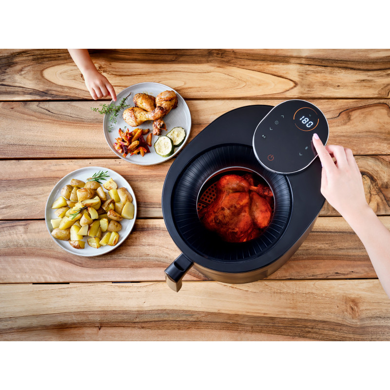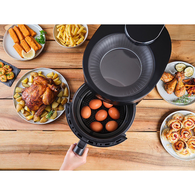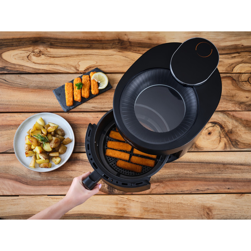 Teplovzdušná fritéza s objemom 5 l a kontrolným okienkom vo vrchnom kryte. Fritovacia nádoba s vyberateľným roštom, vnútorné osvetlenie a 12 programov.
