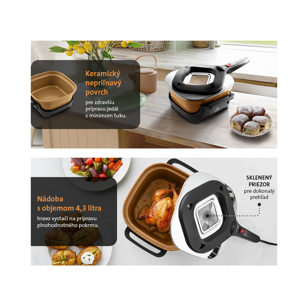 ETA Pečenka prichádza v novom, zdravšom kabáte – s nádobou na pečenie s nepriľnavým keramickým povrchom. Pečenie je úsporné a chutné, ale aj šetrnejšie k zdraviu. Zachováva si pritom všetky obľúbené prednosti Pečenky – rýchly ohrev, rovnomerné pečenie a nízku spotrebu energie. Zvládne varenie, dusenie, zapekanie aj sladké dezerty.