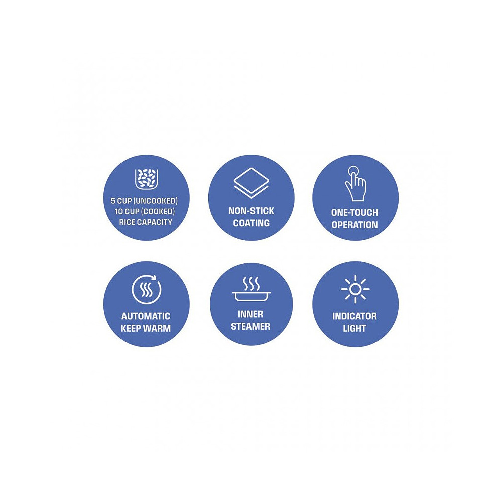 Varič ryže - objem: 1L • kapacita 5 šálok nevarenej ryže • výkon: 400 W • automatické nastavenie teploty • odnímateľný hrniec s nepriľnavým povlakom • kontrolky varenia a ohrievania • sklenené veko s parným otvorom • ovládanie jedným dotykom
