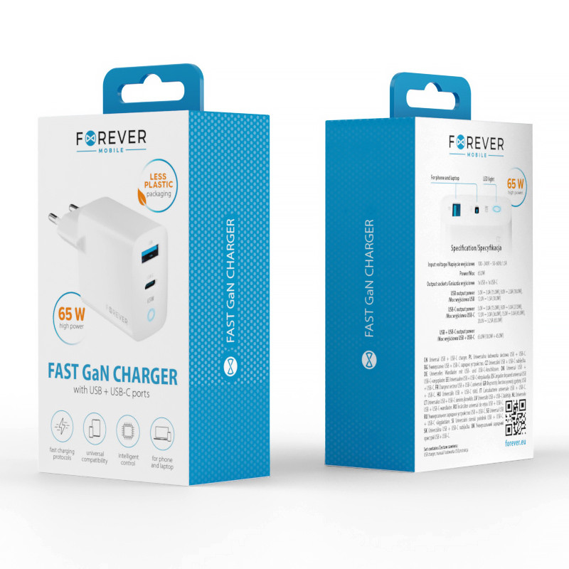 Adaptér 2xUSB 230V/5V-20V USBC+USBA biely FOREVER TC-06-65AC 65W GaN PD+QC