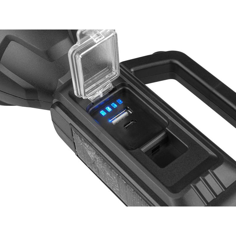 Ručná baterka typu LED svetlomet so vstavanou batériou, solárnym panelom a prídavným rozptýleným svetlom.