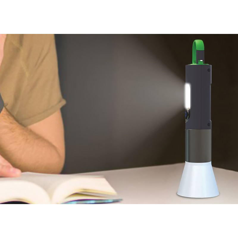 ALU ručná baterka so stolovou základňou 3 v 1 ‒ 5 prevádzkových režimov • dosvit až 500 m • 1x LED COB 10W 1000 lm +7x LED • ZOOM • batéria 1200 mAh • nabíjanie cez USB-C • ochrana IP54 • závesná karabína