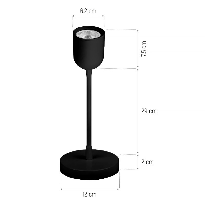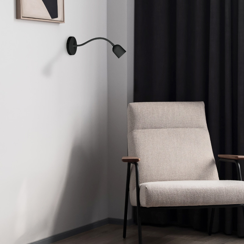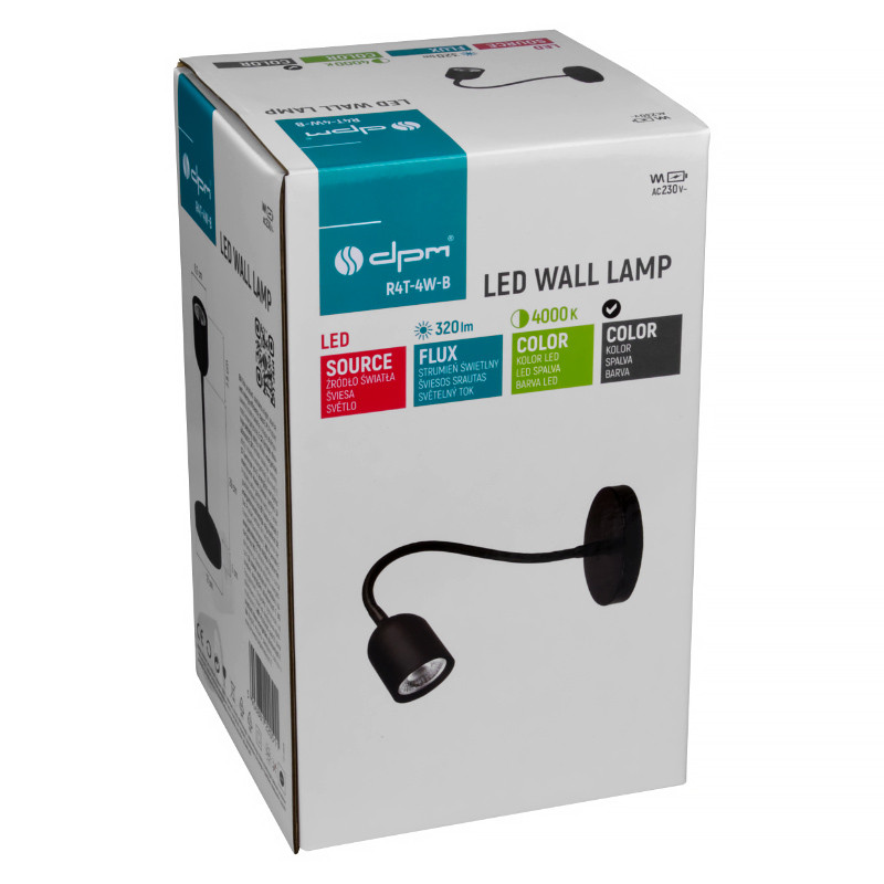Nástenná lampa v čiernej farbe je LED svietidlo s výkonom 4 W a svetelným tokom 320 lm. Lampa vyžaruje neutrálne biele svetlo s teplotou 4 000 K. Svietidlo sa napája zo siete 230 V~ a dĺžka kábla dosahuje 150 cm. Lampa má pružné rameno, ktoré umožňuje nastavenie svetla podľa potreby a vypínač. Priemer základne je 120 mm, priemer tienidla je 62 mm a dĺžka ramena je 290 mm. Stupeň krytia je IP20.