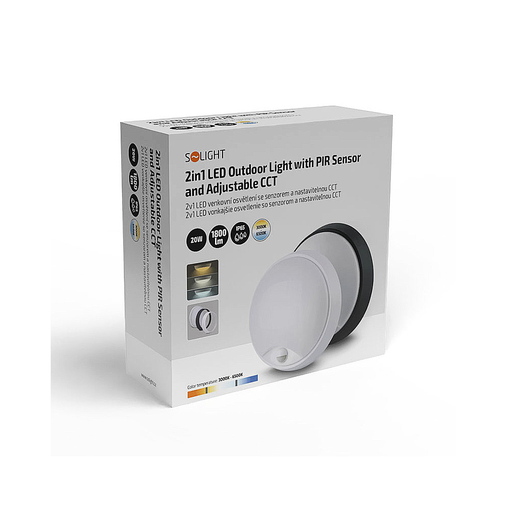 - svetlo disponuje pohybovým sensorom, špeciálnym LED zdrojom s prepínačom, ktorý umožňuje nastavenie teploty svetla (CCT / chromatičnosti) 3000K, 4000K alebo 6500K. Ďalej je možné zvoliť príkon medzi 15/18/20W Balenie je čierne i biele, ktoré je možné podľa potreby vymeniť.