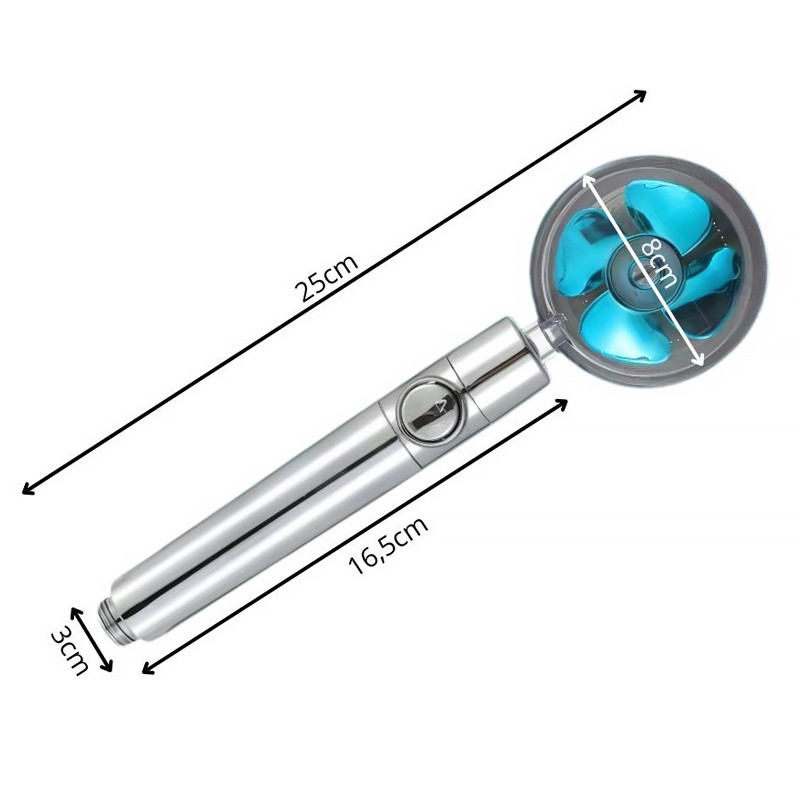 Sprchová hlavica s turbínou, vymeniteľný filter, turbo, s ventilátorom. Moderná sprchová hlavica s turbínou a vstavaným filtrom je inovatívnym riešením, ktoré poskytuje intenzívny a ekonomický prúd vody. Vďaka technológii turbo ventilátora zvyšuje tlak vody, čo umožňuje efektívne a pohodlné používanie sprchy aj pri nízkom tlaku v inštalácii.
