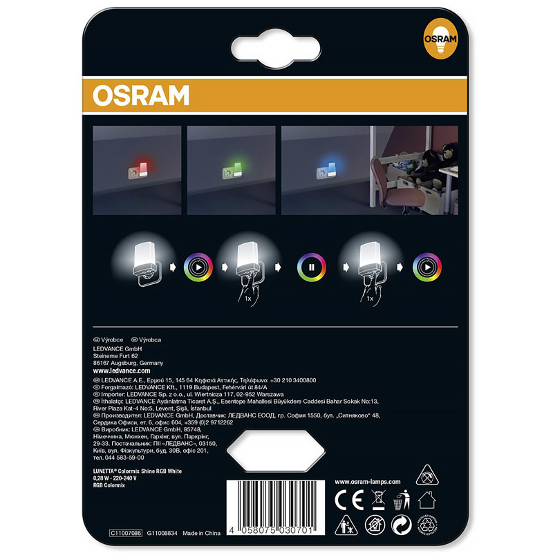 Nočné svetlo Osram Lunetta Shine RGB sa inštaluje priamo do objímky a pomaly mení farbu z jednej farby na druhú. Farbu je možné zastaviť na požadovanej farbe pomocou tlačidla na spodnej strane. Súmrakový spínač automaticky zapne svetlo, keď sa zotmie, a vypne ho, keď je dostatočne jasné. Hodnoty jasu sú zabudované, nie sú nastaviteľné. Ideálne ako nočné svetlo napríklad do detskej izby. Len na vnútorné použitie.