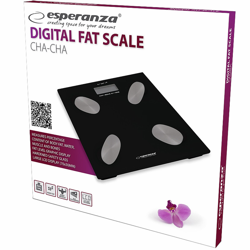 Analytická elektronická váha Esperanza CHA-CHA je určená pre jednotlivcov, ktorí venujú osobitnú pozornosť svojmu zdraviu a fyzickej kondícii. Okrem presného merania telesnej hmotnosti umožňuje zariadenie aj posúdenie percenta telesného tuku, obsahu vody a svalovej hmoty. Váha vyniká moderným dizajnom, veľkým displejom, intuitívnym ovládaním a odolnou konštrukciou, ktorá zaisťuje spoľahlivosť a pohodlie pri používaní.