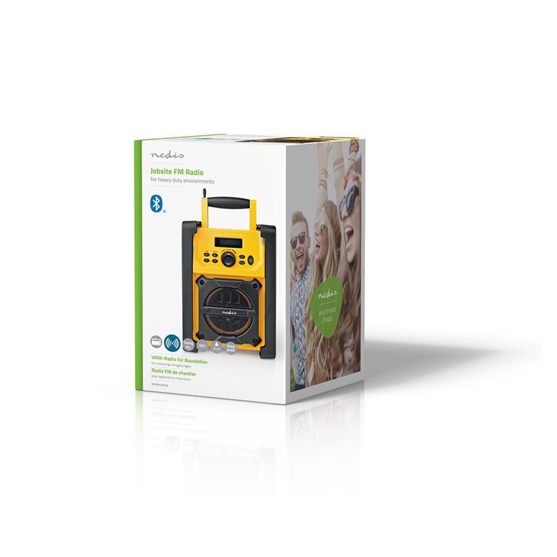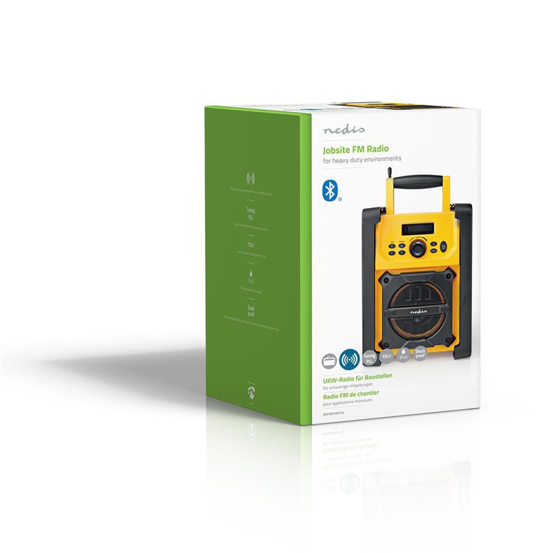 Vďaka ochrane IPX5 je toto Nedis pracovné FM Bluetooth rádio chránené proti dažďu, rozliatemu pitiu a striekajúcej vode. Vďaka tomu je toto rádio dokonalým odolným zvukovým riešením na stavenisko alebo pri domácom majstrovaní. Po stranách sú tlmiče nárazov, ktoré poskytujú riadnu ochranu proti neúmyselným nárazom a úderom, ktorých riziko je už výrazne znížené vďaka jasnej žltej farbe tohto výrobku. Vďaka 20 predvoleným staniciam už nemusíte vyhľadávať svoju obľúbenú FM rádiovú stanicu. Môžete tiež prehrávať vlastné skladby: pripojte buď 3,5 mm konektor so stereofónnym audiovstupom k svojmu smartfónu, alebo streamujte hudbu cez bezdrôtovú technológiu Bluetooth. S týmto FM rádiom môžete počúvať hudbu nepretržite po celý pracovný deň, pretože môže byť napájané batériami (nie sú súčasťou balenia), ale je tiež vybavené napájacím káblom.