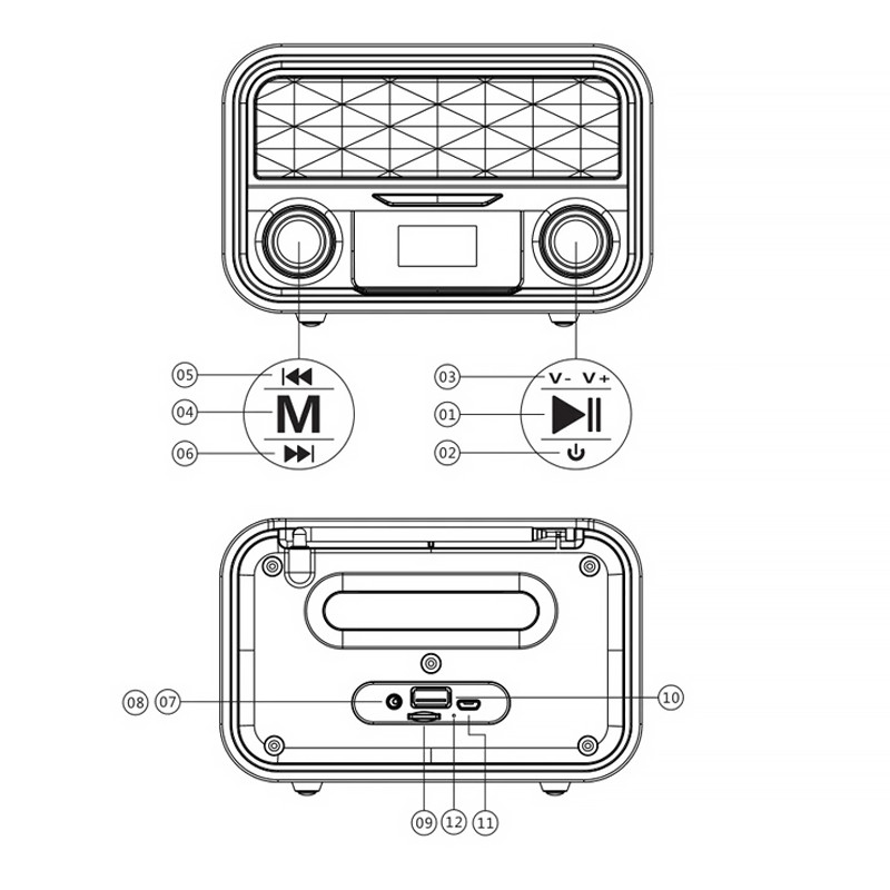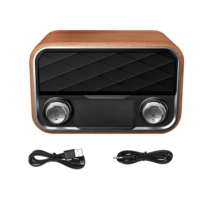 Rádio FM kuchynský reproduktor prenosný RETRO + Bluetooth +AUX +TF +3.5 jack • batéria s výdržou cca 15 hodín • teleskopická anténa • nabíjanie: USB 5V • výkon: 6W • integrovaná 2000mAh batéria • USB kábel • rozmer: 16 x 10,5 x 10 cm