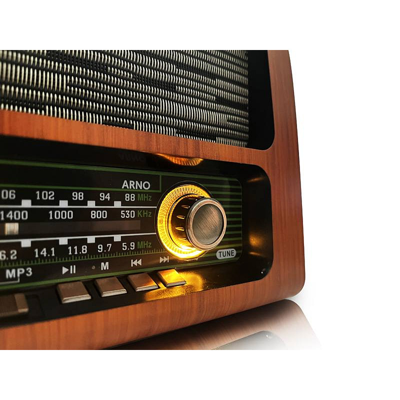Prenosné rádio ARNO LTC 119UBT Retro kombinuje klasickú eleganciu s modernou technológiou. Jeho jedinečný dizajn pripomína zlatý vek rádia, zatiaľ čo podsvietený ciferník mu dodáva jedinečnú atmosféru, ideálnu na domáce aj vonkajšie použitie.