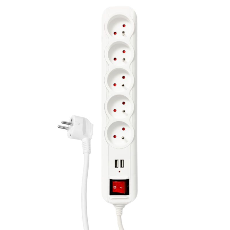 Predlžovací kábel - 5 uzemnených zásuviek • vypínač • 2x USB (DC 5V, 2,1A) • ochrana proti prepätiu a preťaženiu • menovité napätie: AC 230 V ~ 50 Hz • maximálne zaťaženie: 10 A (2300 W) • dĺžka kábla: 1,5 m • typ kábla: H05VV-F 3G1mm2 • biela farba