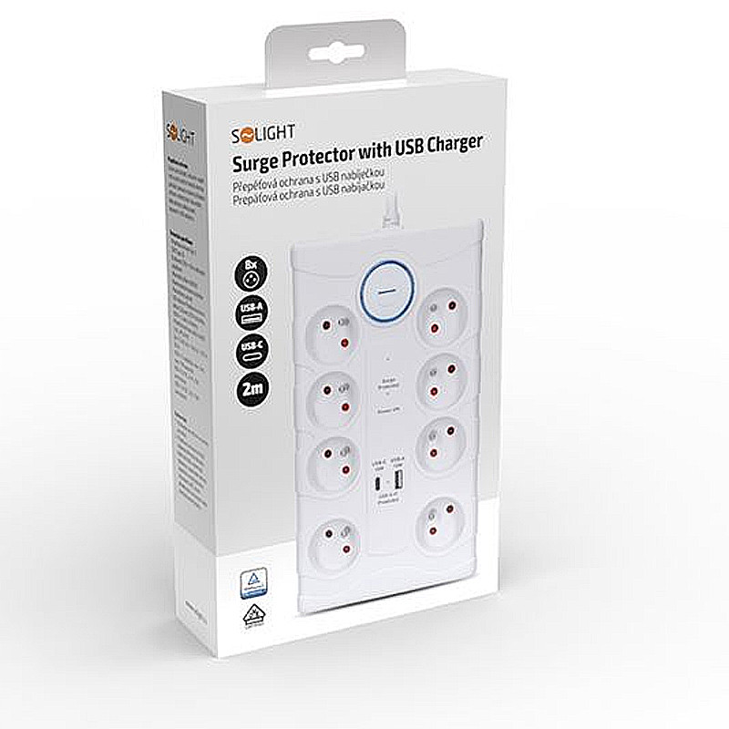 Prepäťová ochrana 2m/8z+V+USBA+USBC SOLIGHT PO80 biela
