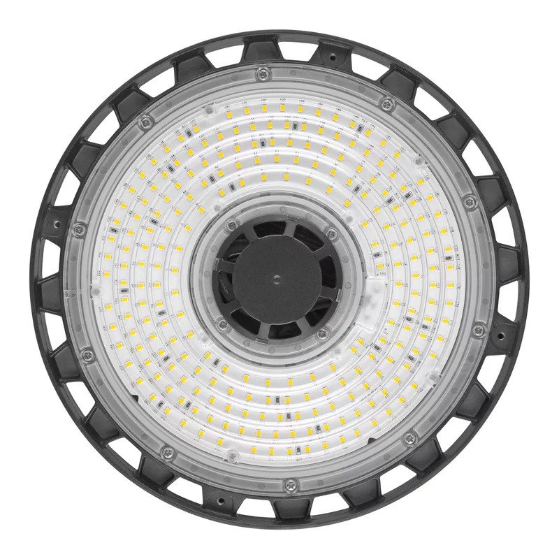 Vysokovýkonné závesné výškové LED svietidlo High Bay, prepínateľný výkon - 75/53 W • svetelný tok: 13500/9540 lm • farba svetla: neutrálna biela (4000K) • napätie: 220-240V • uhol lúča: 110° • ochrana: IP66 • rázová odolnosť: IK10 • materiál: hliník, PC • farba: čierna • priemer: 28 cm • výška: 16,1 cm