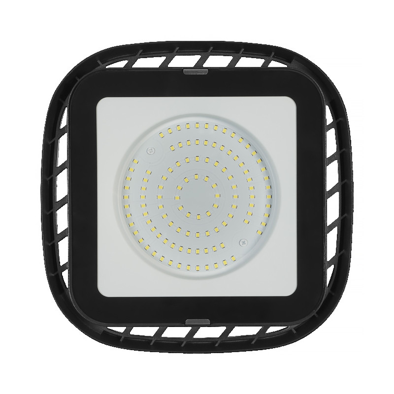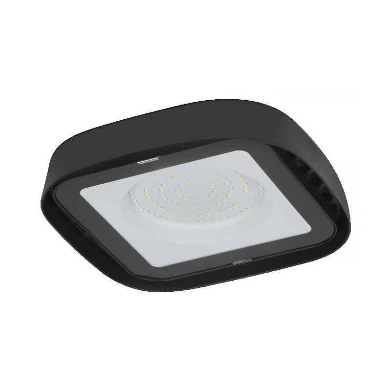 Kompaktné LED svietidlo pre vysoké stropy, závesné, zaoblené ‒ výkon: 80 W • svetelný tok: 9 650 lm • farba svetla: Studená biela (6500K) • svetelná účinnosť: 116 lm/W • ochrana: IP65 • rázová odolnosť: IK05 • napätie: 220-240V • stmievateľné: nie • farba: čierna • materiál: hliník • rozmer: 23x23x8 cm