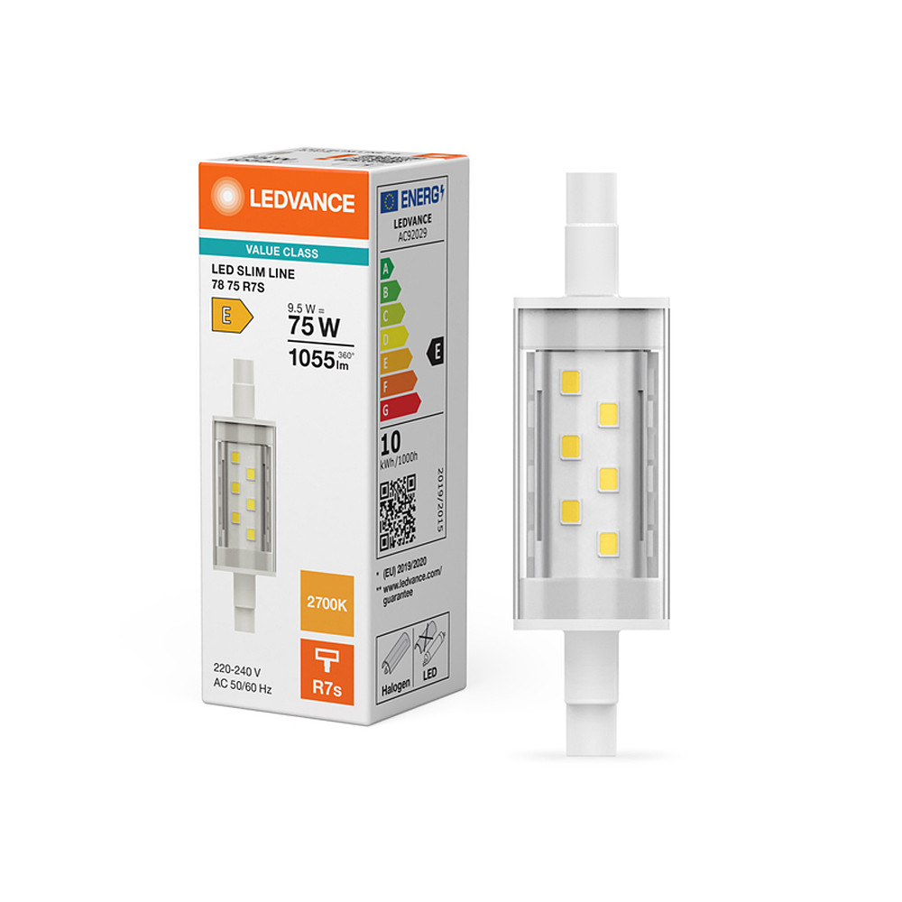 LED žiarovka - pätica: R7s - výkon: 9,5 W • ekvivalent: 75 W • svetelný tok: 1055 lm • farba svetla: Teplá biela (2700K) • napätie: 220-240V • dĺžka: 78 mm • priemer: 20 mm