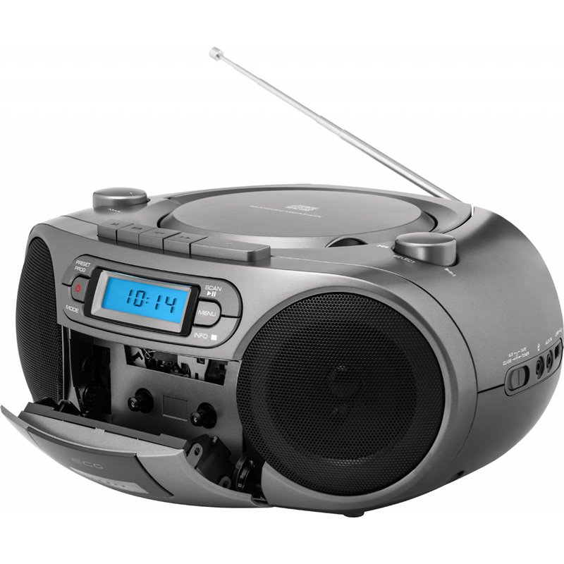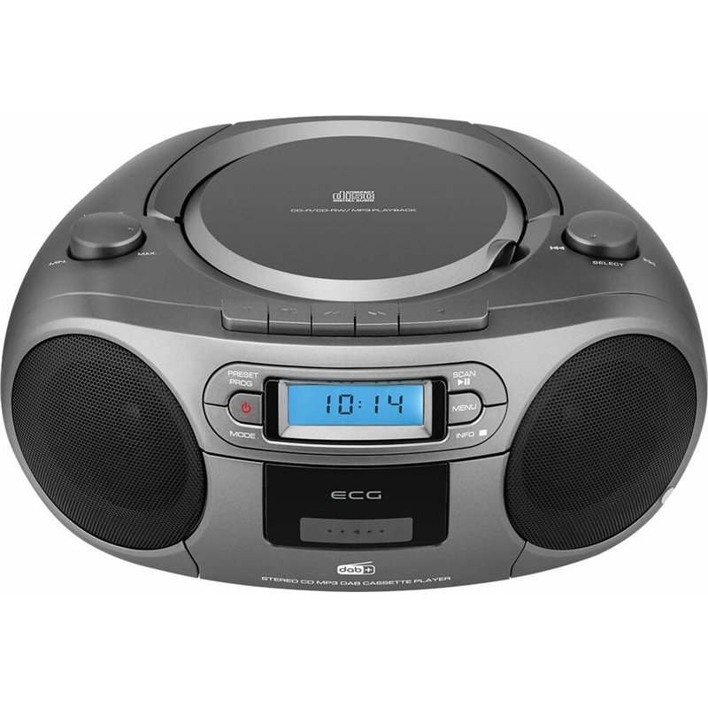 Klasický prenosný rádioprehrávač ECG CDR 999 DAB v sivom prevedení ponúka širokú škálu možností prehrávania hudby. Okrem zabudovaného digitálneho tunera DAB+/FM s automatickým vyhľadávaním rádiostaníc a možnosťou uloženia až 20 predvolieb, ponúka aj integrovaný vstup na pripojenie USB kľúča (prehráva MP3 a WMA súbory). Disponuje aj Aux vstupom pre pripojenie externého zariadenia a nechýba ani konektor pre pripojenie stereo slúchadiel. CD prehrávač vám umožní prehrávať aj playlisty uložené na CD diskoch (CD / CD-R / CD-RW) a s určitosťou poteší aj klasický kazetový prehrávač. Najpodstatnejšie informácie sú zobrazované na prehľadnom LCD displeji so svetlo modrým podsvietením a o príjemne znejúce tóny sa postarajú zabudované reproduktory s výkonom 2 x1,5 W. Prístroj možno napájať z elektrickej siete alebo batériami.