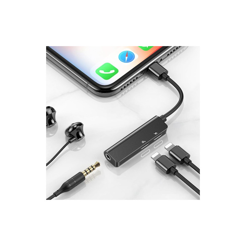 Adaptér určený pre zariadenia Apple. Umožňuje vám pripojiť káblové slúchadlá s 3,5 mm jack konektorom k smartfónom, ktoré nie sú vybavené jack konektorom. Nepodporuje hovory, iba prehrávanie hudby. Zariadenie je možné nabíjať alebo prenášať dáta cez 8-pólové zásuvky.