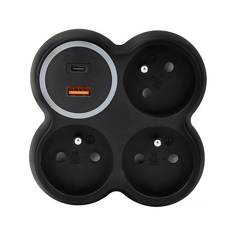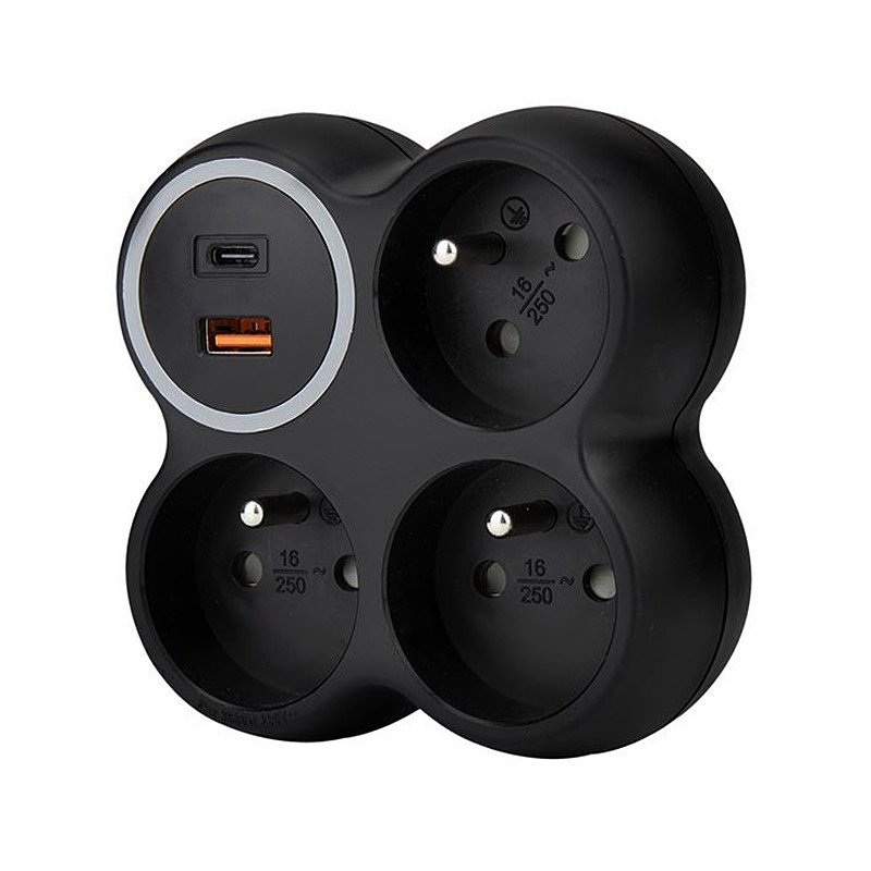 Rozbočka a USB rýchlonabíjačka v jednom. Aj rozbočka môže vyzerať pekne a byť hodnotným doplnkom interiéru. Spracovaná v dizajnovom štúdiu, vyrobená z kvalitných materiálov, s povrchovou úpravou príjemnou na dotyk. Kombinácia matnej čiernej farby a šedého krúžku okolo USB decentne ladí v modernom interiéri.