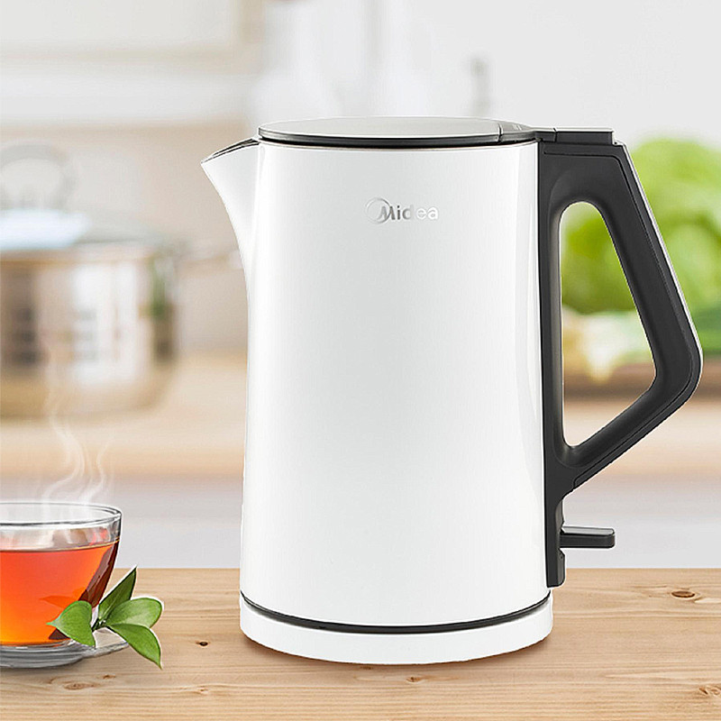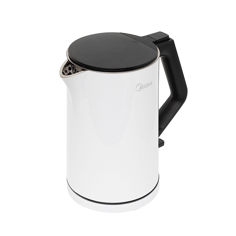 MIDEA rýchlovarná kanvica • dvojitý plášť - ochrana pred horúcim vonkajším krytom • 1,5 l kapacita • bezzvarové vnútro z nehrdzavejúcej ocele, jednoduché čistenie • rýchle ohrievanie • výkon: 1850 - 2200 W • otváranie krytu stlačením tlačidla