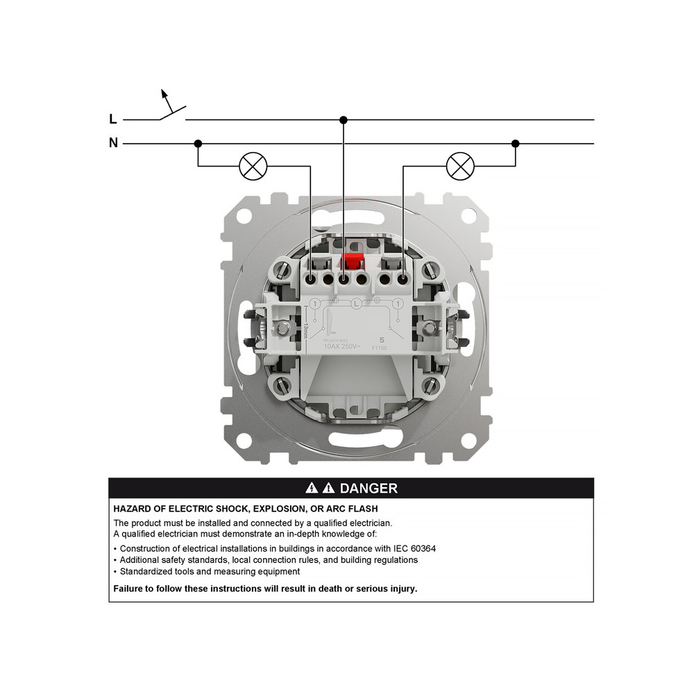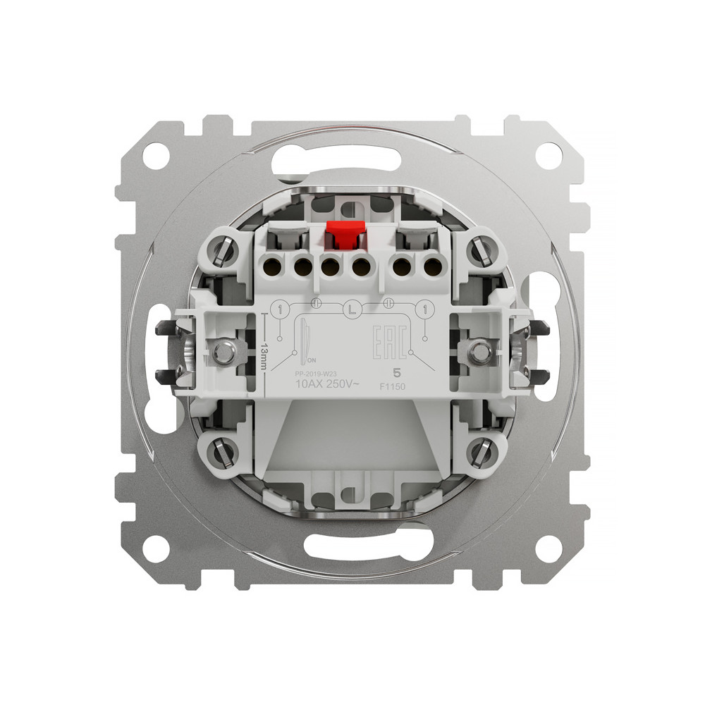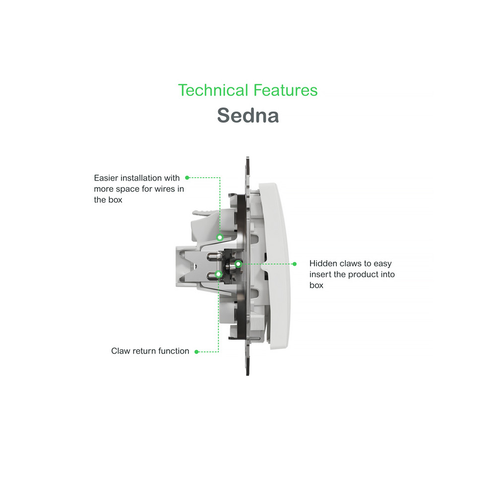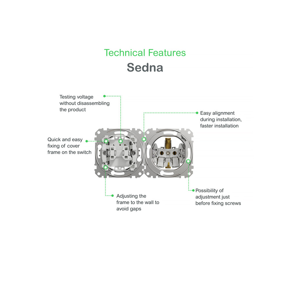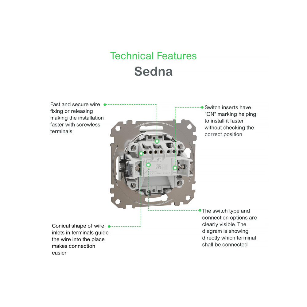 Toto je mechanizmus vypínača Schneider Electric Sedna Design & Elements s montážnym rámom. Toto je dvojcestný vypínač. Na ovládanie sa používa kolíska/tlačidlo. Pripojenie zariadenia je pomocou bezskrutkových svoriek. Spôsob upevnenia zariadenia je pomocou skrutiek a rozperiek. Jeho menovité prevádzkové napätie Ue je 250 V AC pri 50/60 Hz. Menovitý prúd je 10AX. Toto zariadenie je určené na zapustenú montáž. Rozmery produktu sú (Š) 73 mm × (V) 73 mm × (H) 37 mm. Výstupná hĺbka je 24 mm. Je vyrobený z termoplastu ABS stabilizovaného proti UV žiareniu. Farba produktu je biela s lesklou povrchovou úpravou. Dosahuje stupeň krytia IP20. Sedna Design & Elements je nová generácia elektrických vypínačov inšpirovaná módou a interiérovým dizajnom. Vďaka moderným líniám, ktoré odrážajú dnešné trendy, a prepracovanej estetike je Sedna viac než len doplnok. Sedna Design & Elements ide ešte ďalej z hľadiska ergonómie, jednoduchosti inštalácie a používania, spoľahlivosti a kvalitného vyhotovenia. Produkt je v súlade s normou IEC 60669-1. Má certifikáciu GOST-R.