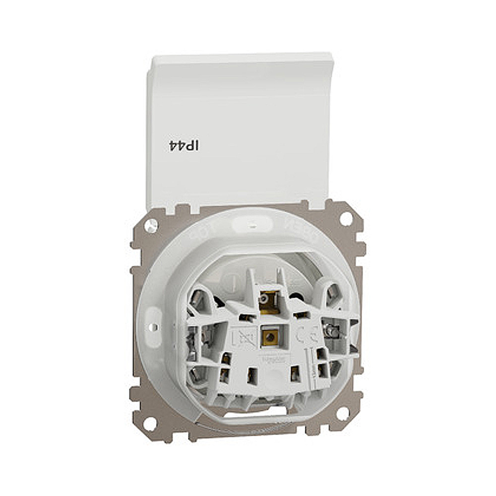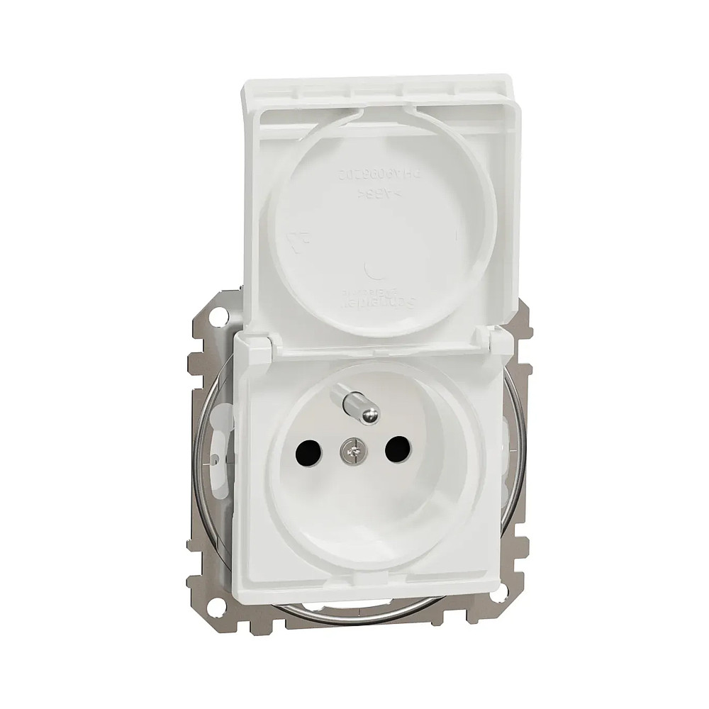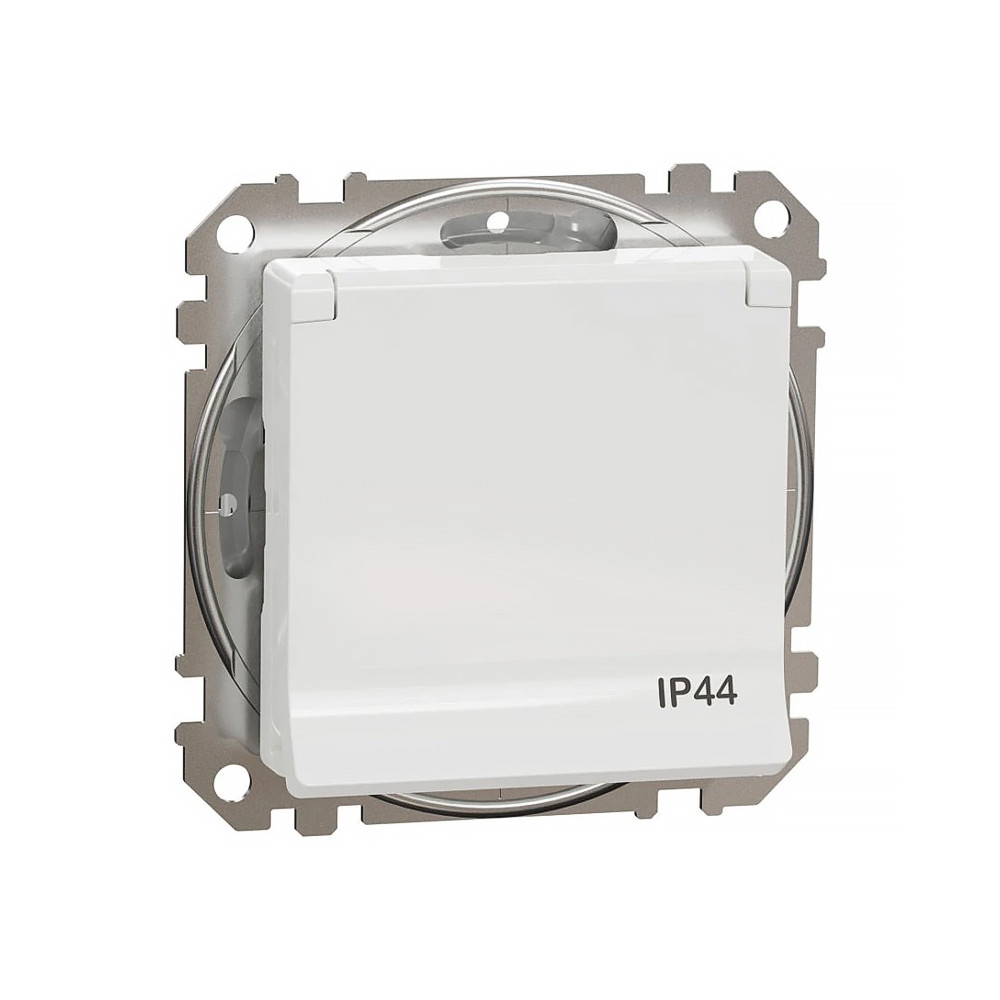 Biela IP44 zásuvka Sedna 2P+PE s viečkom, clonkami a bezskrutkovými svorkami, zo série Sedna Design od Schneider Electric. Zásuvka má lesklý biely povrch, rozmery: šírka 73 mm, výška 73 mm, hĺbka 50 mm a hĺbka presahu 29 mm. Dĺžka odizolovania kábla je 13 mm. Má stupeň krytia IP44 a maximálnu povolenú záťaž 3680W a 16A. Vyrobená je z termoplastu so zvýšenou odolnosťou voči UV žiareniu. Verzia s vyšším krytím IP44 je odolná voči prachu a vode.
