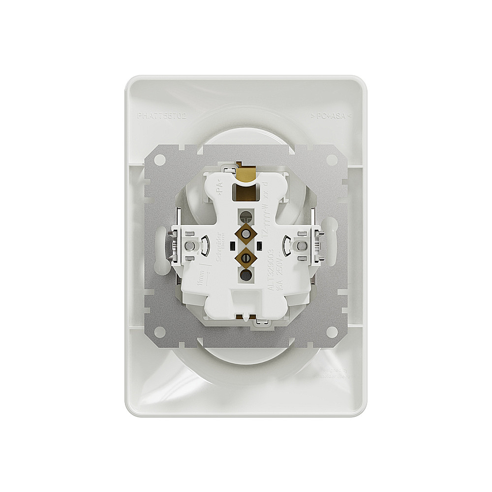 Biela 2-násobná zásuvka Sedna 2x 2P+PE s clonkami a skrutkovými svorkami, zo série Sedna Design od Schneider Electric. Zásuvka má lesklý biely povrch, rozmery: šírka 120 mm, výška 85 mm, hĺbka 45 mm. Dĺžka odizolovania kábla je 13 mm. Má stupeň krytia IP20 a maximálnu povolenú záťaž 3680W a 16A. Vyrobená je z termoplastu so zvýšenou odolnosťou voči UV žiareniu. Prístroj je dodávaný ako celok s krycím rámčekom. Dvojnásobné zásuvky nie je možné osádzať do jednonásobných ani viacnásobných rámčekov, ani do krabíc na povrchovú montáž.