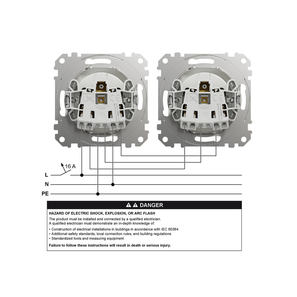 Biela zásuvka Sedna 2P+PE s clonkami a bezskrutkovými svorkami, zo série Sedna Design od Schneider Electric. Zásuvka má lesklý biely povrch, rozmery: šírka 73 mm, výška 73 mm, hĺbka 38 mm a hĺbka presahu 29 mm. Dĺžka odizolovania kábla je 13 mm. Má stupeň krytia IP20 a maximálnu povolenú záťaž 3680W a 16A. Vyrobená je z termoplastu so zvýšenou odolnosťou voči UV žiareniu.