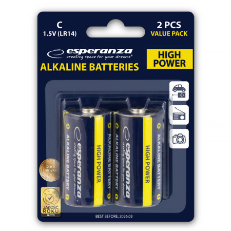 Alkalické batérie Esperanza typu C (LR14). Určené na každodenné použitie v zariadeniach s vysokou...