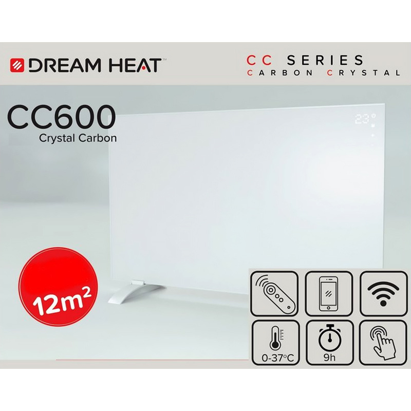 Infračervený radiátorový ohrievač Dream Heat CC 600 WiFi ‒ využíva metódu vykurovania diaľkovým infračerveným žiarením založenú na uhlíkovom kryštáli. Ohrievač kombinuje moderný, ultratenký dizajn s energeticky úspornou, tichou a zdravotne nezávadnou technológiou vykurovania. Poskytuje okamžitý pocit tepla podobný prirodzenému teplu slnka. Integrovaný LED displej s dotykom, diaľkové ovládanie +App. Výkon 600 W pre miestnosť o rozlohe až 12 m². Rozmery: 100 x 60 cm