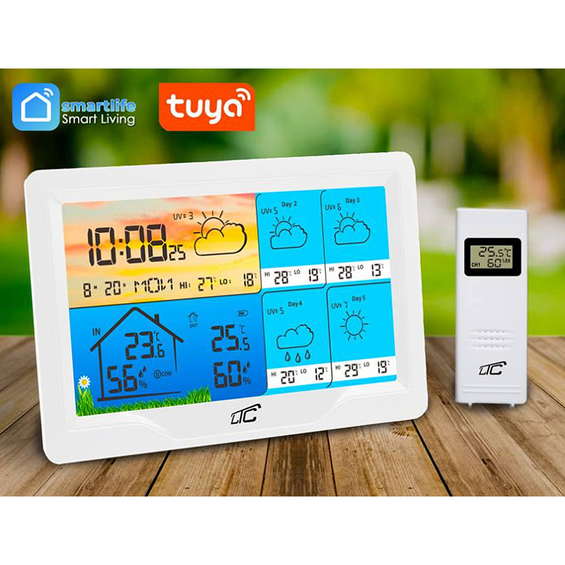 Smart farebná meteostanica - WiFi, Tuya, Smartlife • predpoveď na 4 dni vopred • presné meranie teploty • presné meranie vlhkosti • synchronizácia času • alarm • napájanie z batérie alebo siete.