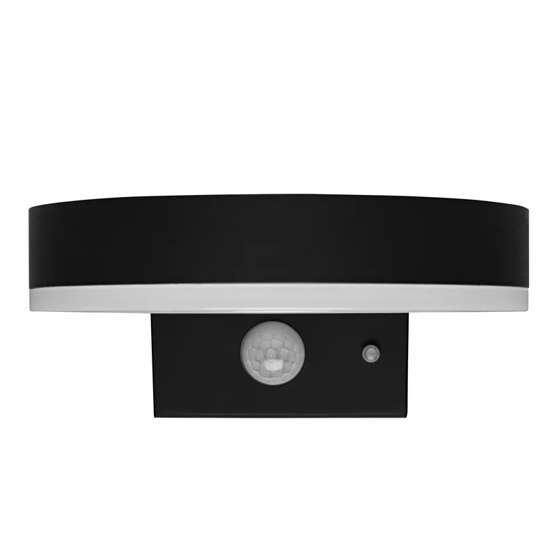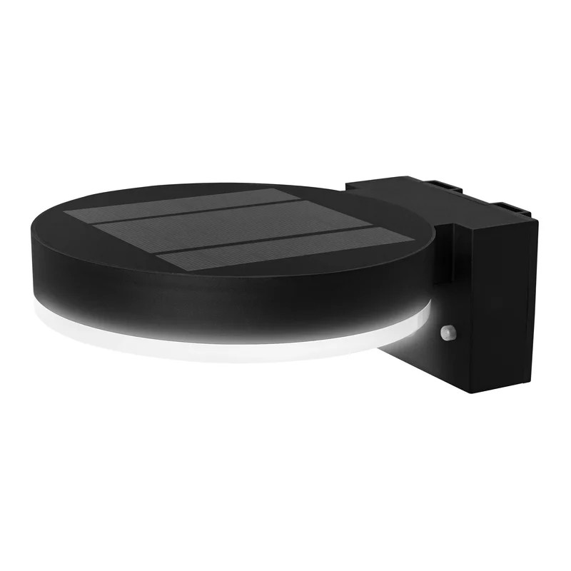 Vonkajšie solárne okrúhle nástenné LED svietidlo so senzorom - 3 prepínateľné režimy svietenia • výkon: 6 W • svetelný tok: 600 lm • farba svetla: teplá biela (3000K) • materiál: kov • farba: čierna