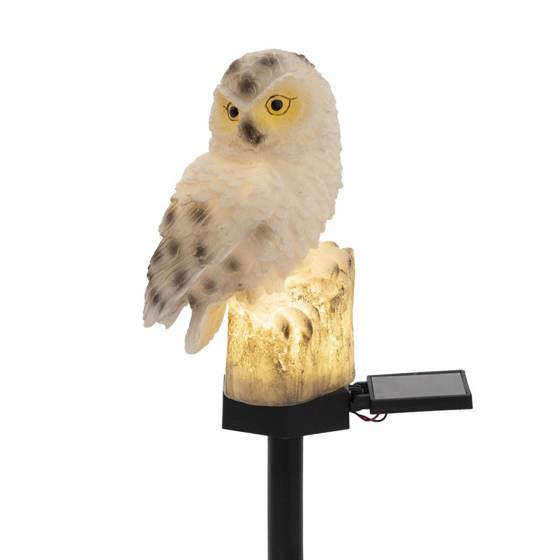 Solárne záhradné svietidlo, sova, možno zapichnúť do zeme • 1 teplá biela LED • vypínač • zabudovaný solárny panel a nabíjačka akumulátora: cez deň sa nabíja, v noci svieti • prevedenie odolné voči poveternostným podmienkam • materiál: umelá živica+plast • napájanie: 1,2 V, AAA 300 mAh Ni-MH akumulátor • hmotnosť: 238 g