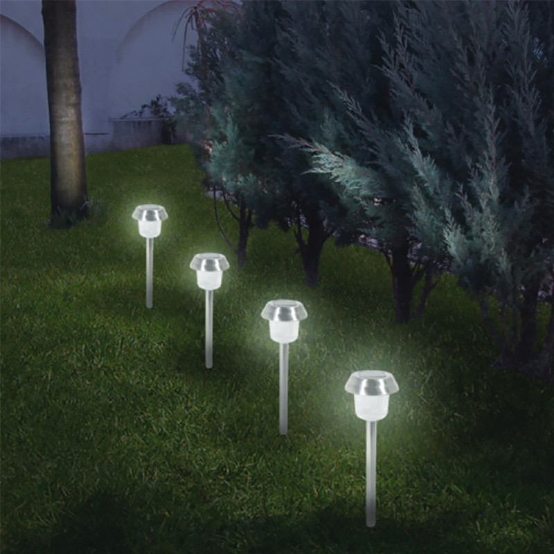 Solárne záhradné svietidlo, kovové ‒ automatické zapnutie • až 8 hodín nepretržitá prevádzka • zabudovaná solárna batéria • cez deň sa nabíja, v noci svieti • 1 ks bielej LED s vysokou svietivosťou • odolné proti poveternostným podmienkam • materiál: nehrdzavejúci kov • možnosť zapichnutia do zeme • vymeniteľný (1,2 V/600 mAh) AA Ni-Mh akumulátor • celková výška: 40 cm
