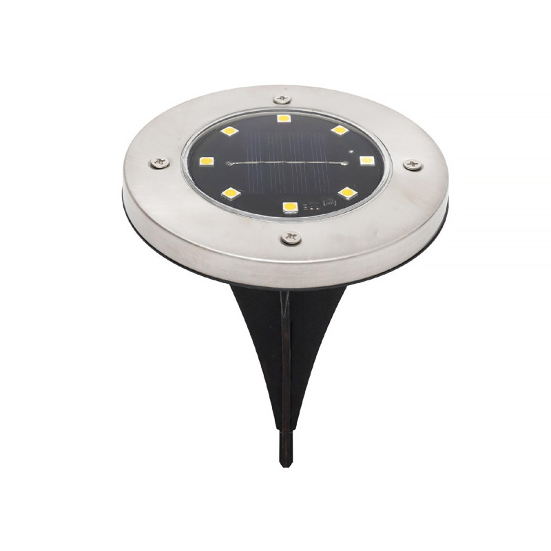 Ploché solárne záhradné svietidlo, 2 ks sada ‒ prevedenie kov+plast • 8 veľkých teplých bielych LED • automatické zapnutie • vypínač • zabudovaný solárny panel+nabíjačka: cez deň sa nabíja, v noci svieti • ochrana IP44 proti striekajúcej vode • napájanie: 1x 1.2V, 200 mAh AA Ni-MH akumulátor • rozmery: ø12cm x 14cm so zapichovacím hrotom
