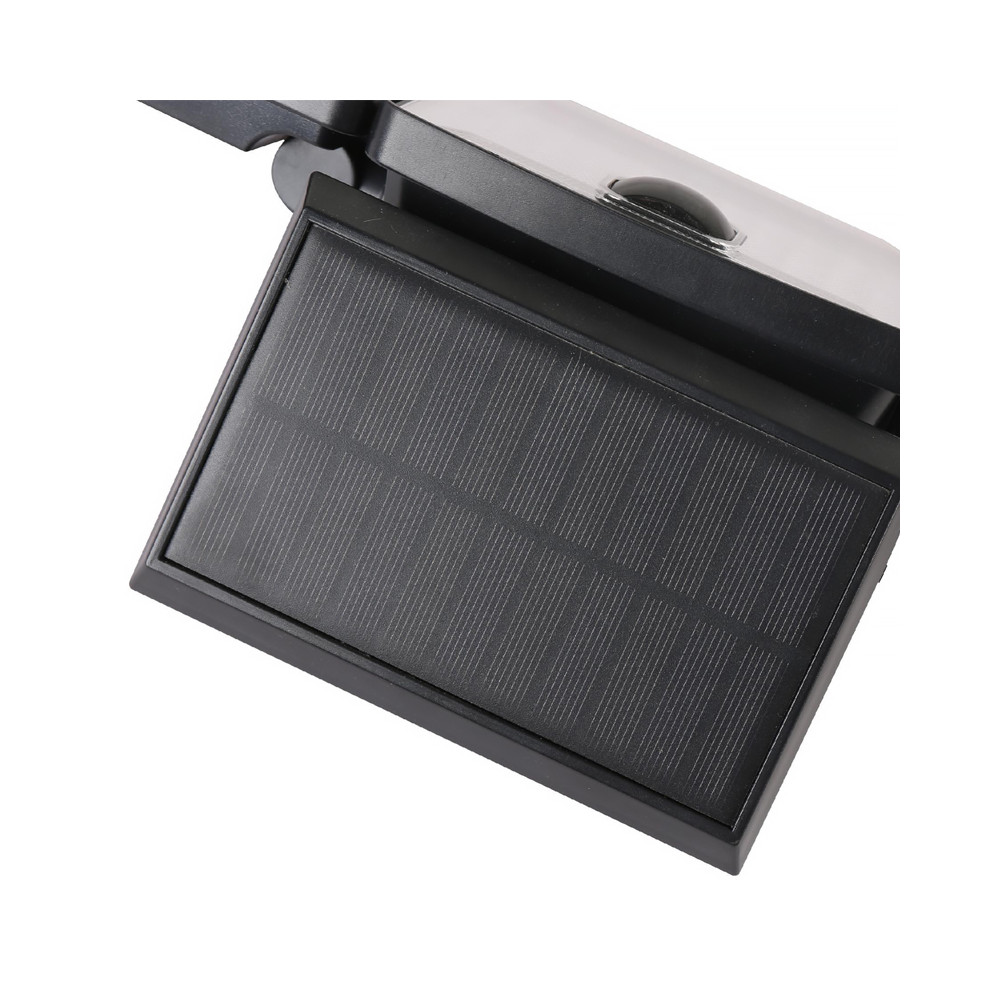 Nastaviteľný solárny LED reflektor so senzorom pohybu - 161ks studených bielych LED • 700 lm / Studená biela (6500K) • 3 režimy osvetlenia • otáčateľné a sklopiteľné • IP65: odolné voči tryskajúcej vode • napájanie: 1x 3,7V 18650 Li-ion akumulátor 3600 mAh • upevňovacie prvky sú príslušenstvom