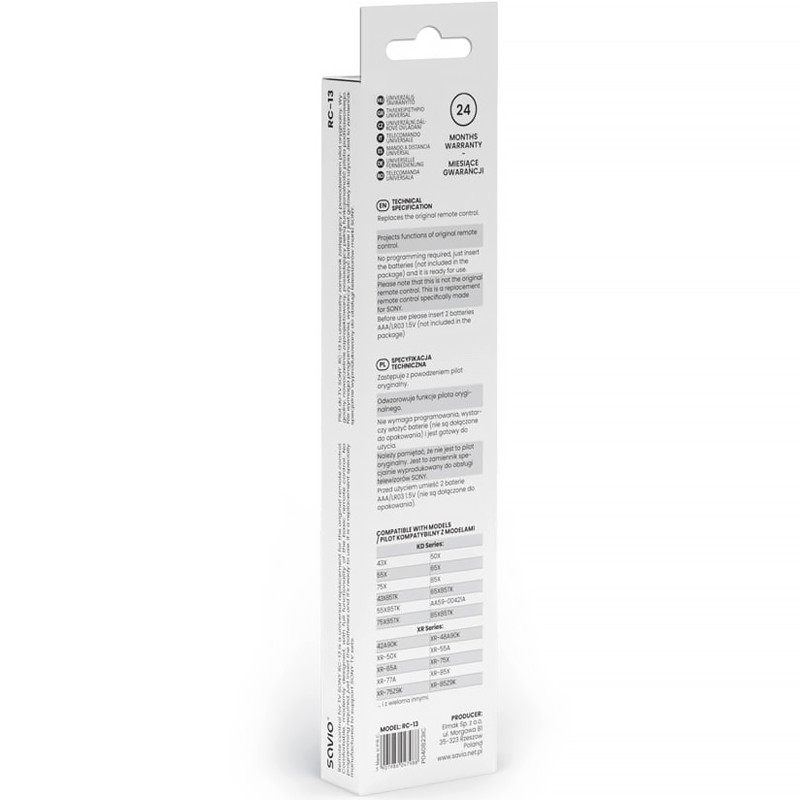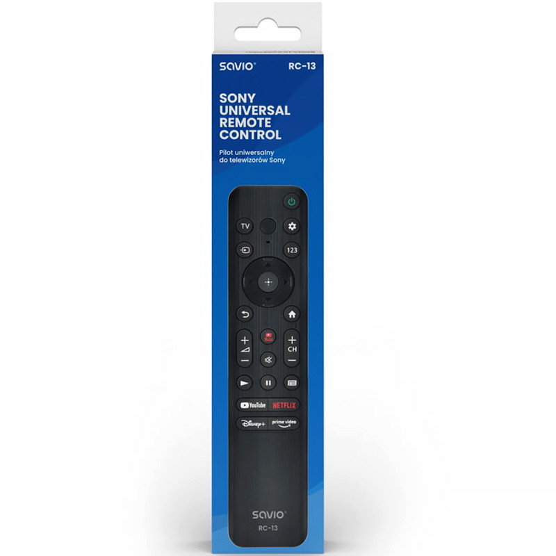 Je váš pôvodný diaľkový ovládač poškodený alebo stratený? Vyberte si účinnú náhradu za RC-13 od spoločnosti Savio. V univerzálnom diaľkovom ovládači RC-13 sme reprodukovali všetky najdôležitejšie funkcie pôvodného diaľkového ovládača. To zahŕňalo jeho programovanie a konfiguráciu tak, aby fungoval s televízorom Sony rovnako efektívne ako jeho predchodca. Univerzálny diaľkový ovládač Savio má všetky potrebné tlačidlá a funkcie. To všetko preto, aby bolo jeho používanie pre vás čo najintuitívnejšie a najpohodlnejšie.