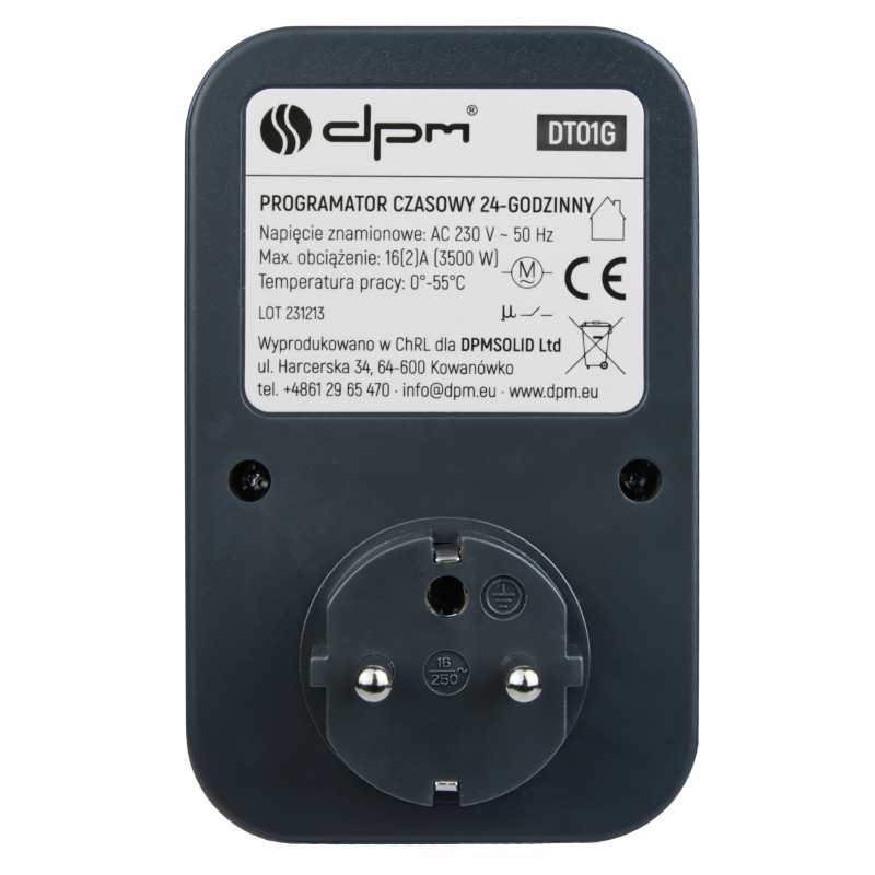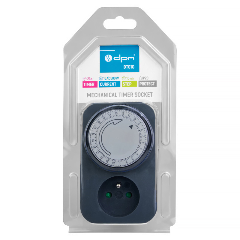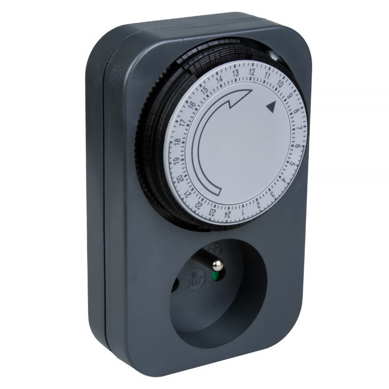 24-hodinový analógový časovač mechanický - nastavenie času po: 15 min. • zásuvka s uzemnením • max.záťaž: 16A (3500 W) • krytie: IP20 • prevedenie: sivé