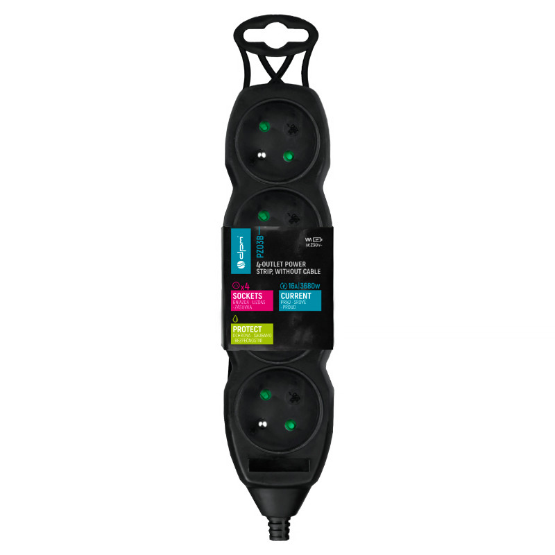 Predlžovacia lišta pre svojpomocnú montáž na elektrický kábel • 4 uzemnené zásuvky • odporúčaný kábel 3G1,5mm2 (max.16 A) • farba: čierna