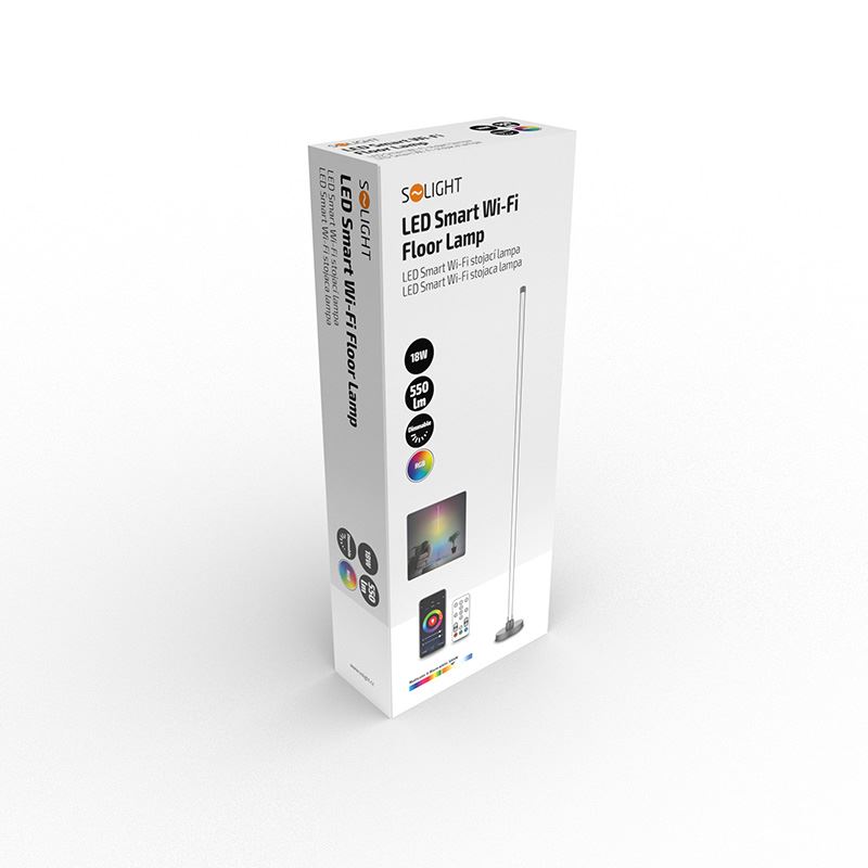 - LED SMART WIFI stojaca lampa je ovládaná chytrým telefónom. Podporuje Wifi 2,4GHz, Android 4.1 a vyššie a IOS 8.0 a vyššie. Umožňuje nastavovať rôzne režimy svietenia, farby (RGB) a intenzitu svetla. LED pásik možno ovládať aj diaľkovým ovládačom, ktorý je súčasťou balenia.