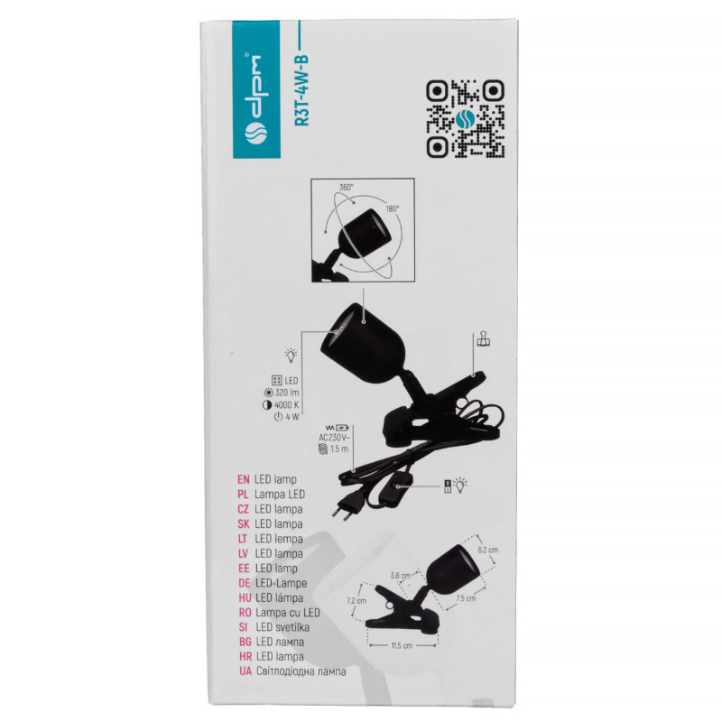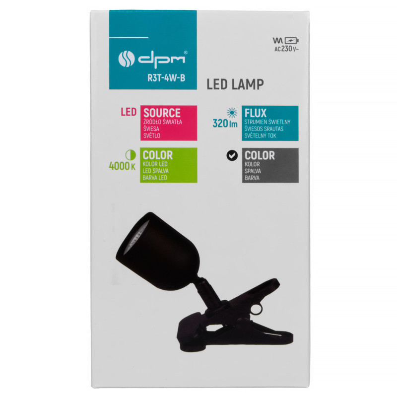 LED lampa s klipom v čiernej farbe vhodná na osvetlenie pracovného stola, kuchynskej linky alebo skrinky. Má výkon 4 W a svetelný tok 320 lm. Farba svetla je 4 000 K, čo zodpovedá neutrálnemu bielemu svetlu. Napájanie lampy je zo siete 230 V~ a dĺžka kábla je 150 cm. Priemer tienidla je 62 mm.