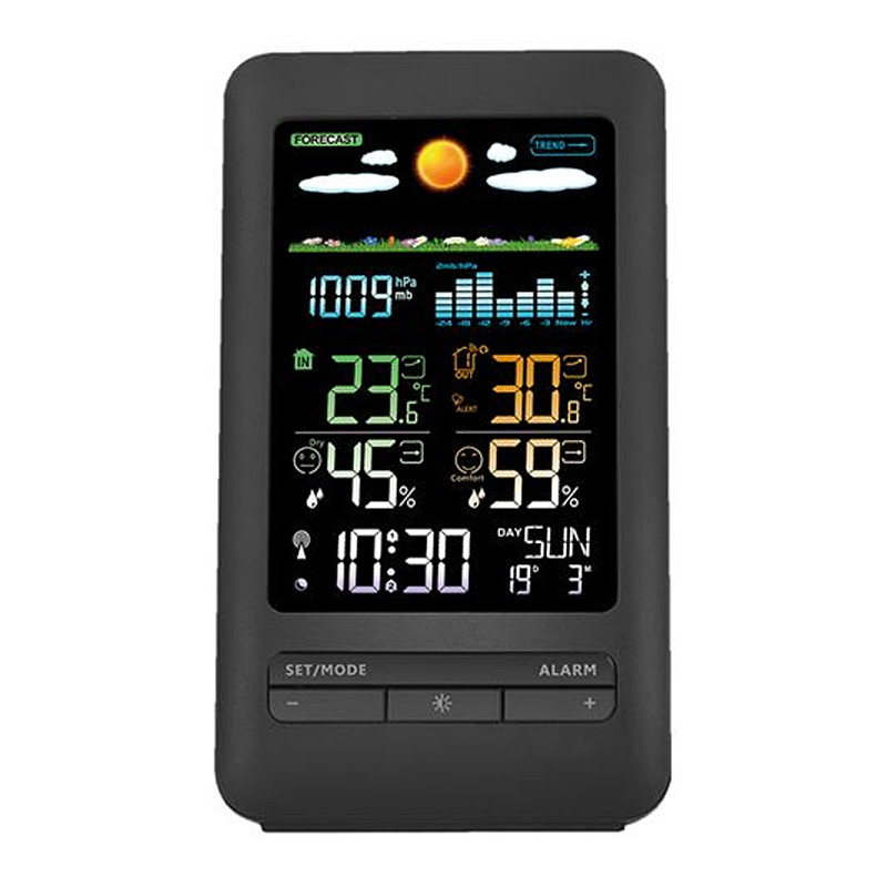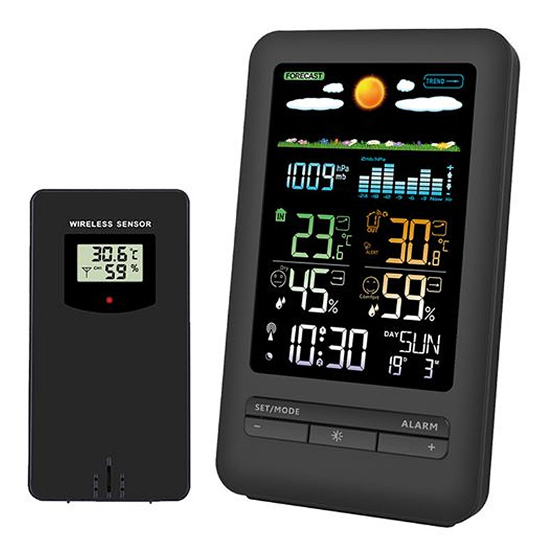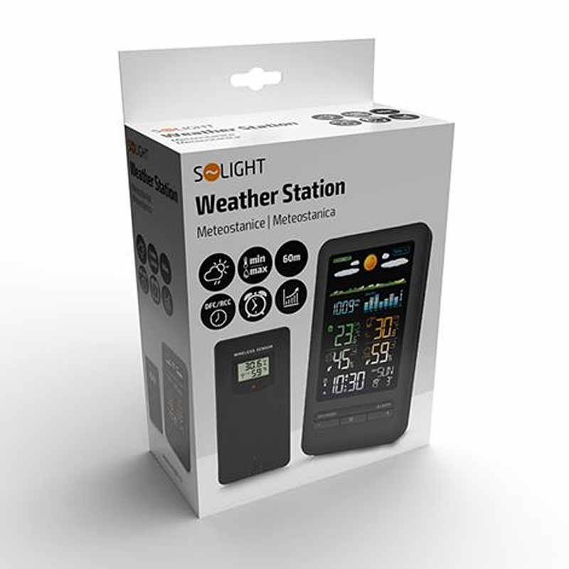 Meteostanica, čierna • farebný LCD • vnútorná/vonkajšia teplota a vlhkosť • tlak • budík • rádiovo nastavované hodiny • bezdrôtový vonkajší senzor • predpoveď počasia • napájanie: (2+2)x AA batérie (LR6)