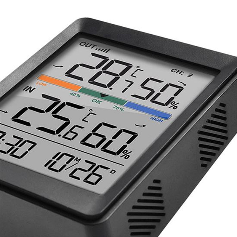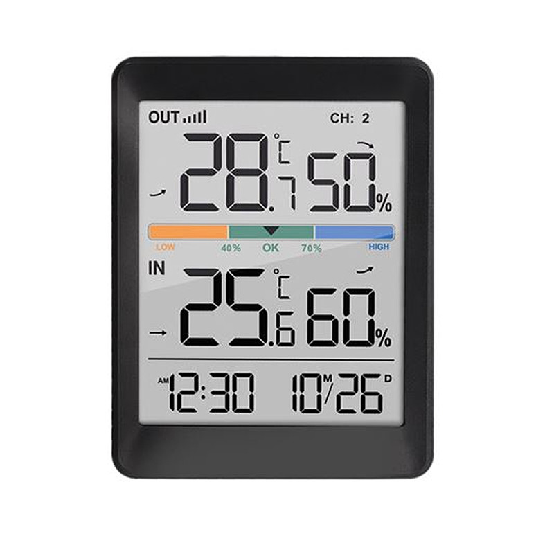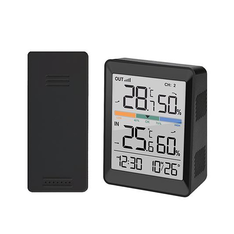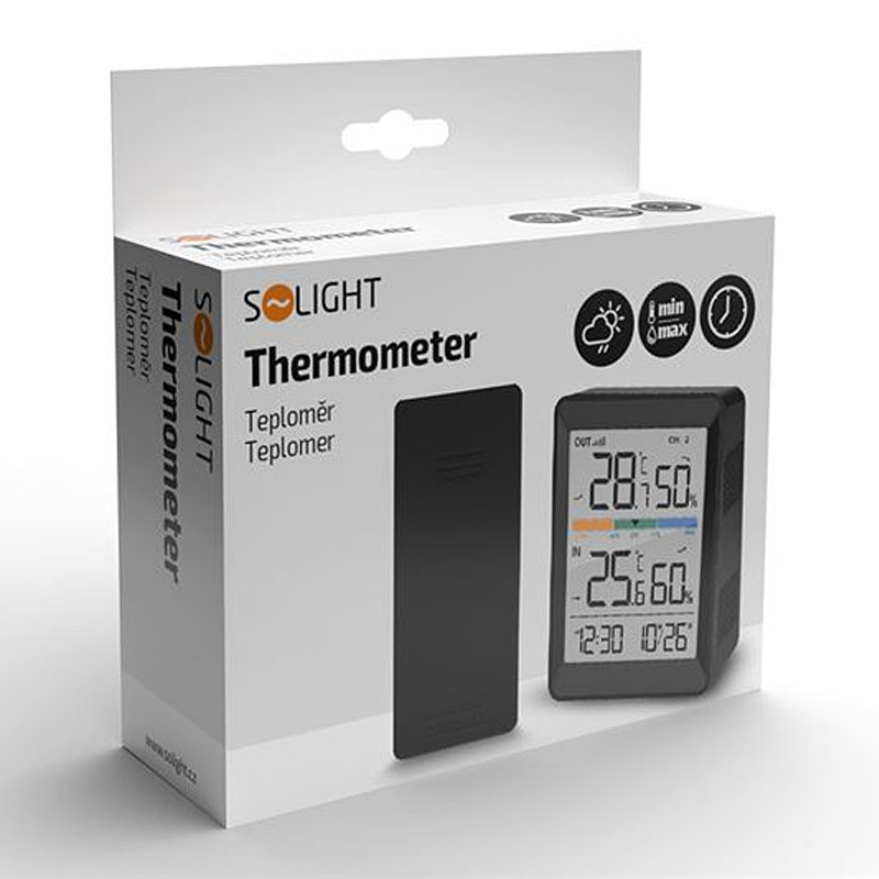Digitálny teplomer a vlhkomer s meraním vnútornej teploty (-9,9 až +50°C) a vonkajšej teploty (-40 až +70°C). Meranie vnútornej a vonkajšej vlhkosti (20 až 95%). Pamäť minimálnych a maximálnych hodnôt, ukazovateľ trendu teploty a vlhkosti. Funkcie hodín, budíka a časového formátu. Súčasťou je bezdrôtový snímač s dosahom až 60 m (bez prekážok). Napájanie: hlavná jednotka 2x batérie AAA, snímač 2x batérie AAA (nie sú súčasťou dodávky). farba: čierna.