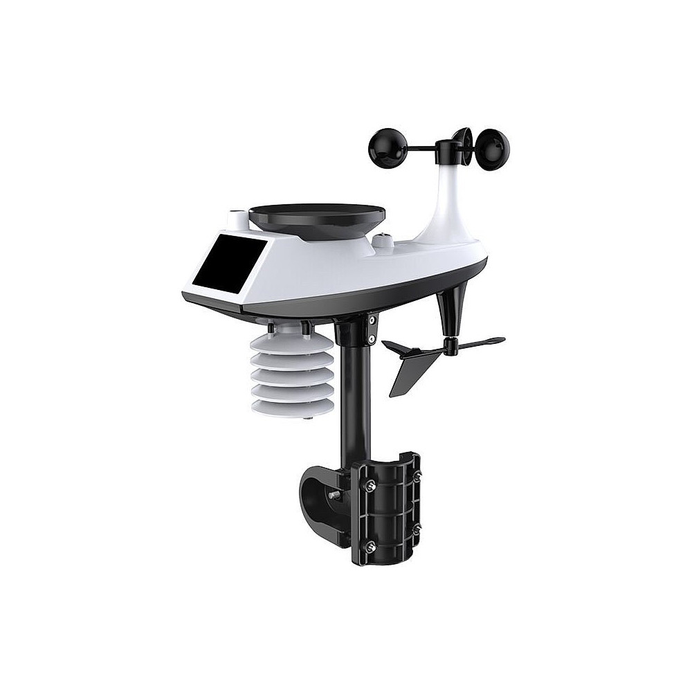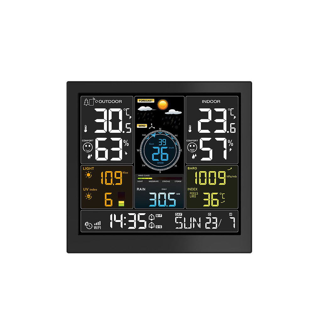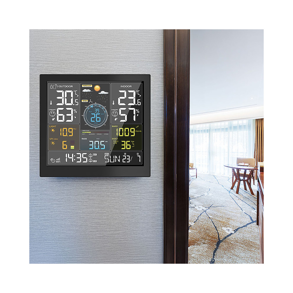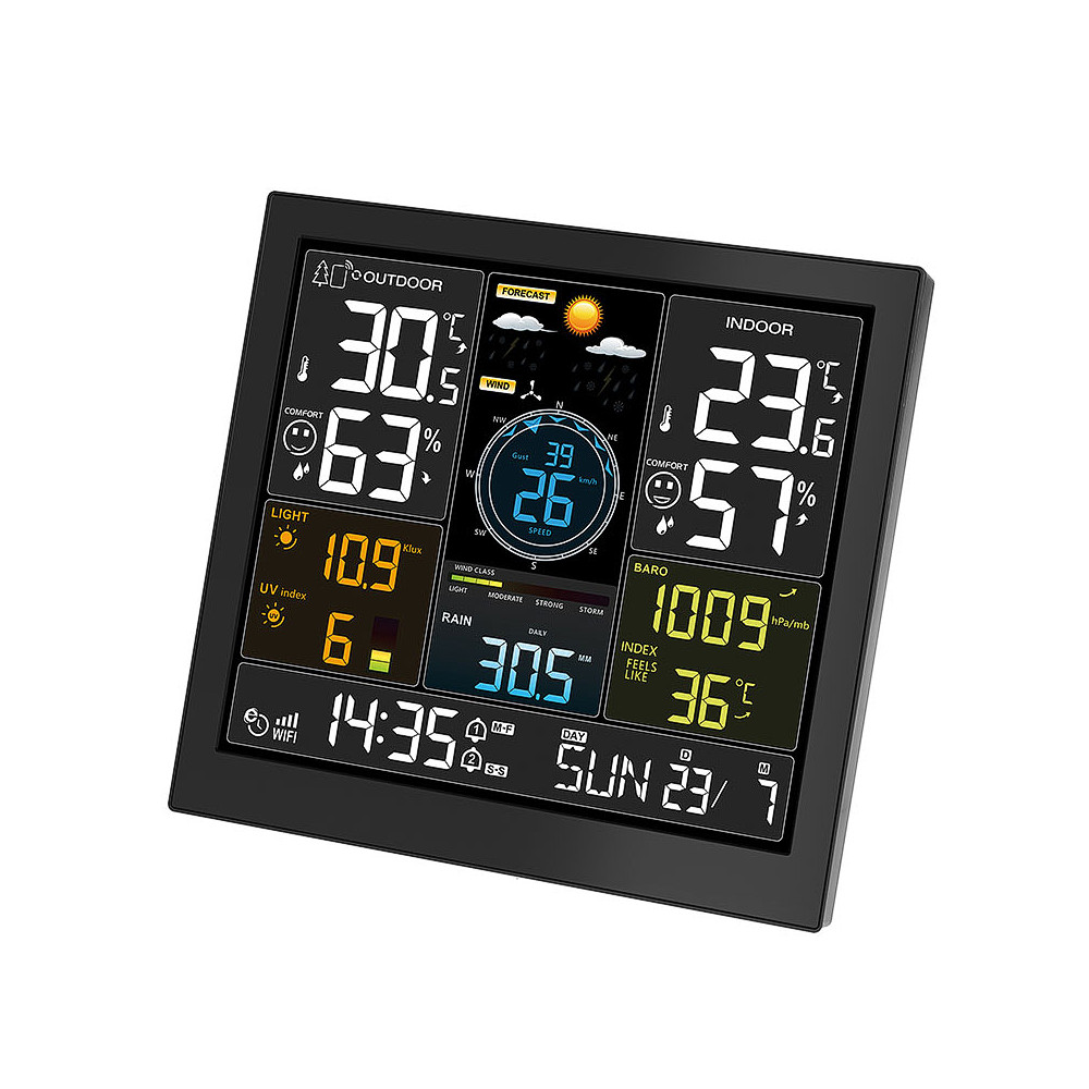 Profesionálna meteorologická stanica s veľkým 24,4 cm displejom ponúka pripojenie WiFi a pripojenie k aplikácii Tuya/Smart Life na zobrazenie aktuálnych údajov a štatistík. Meria o.i. vnútornú a vonkajšiu teplotu, vlhkosť, rýchlosť vetra, smer vetra, zrážky, atmosférický tlak, intenzitu svetla a UV index. Ponúka automatickú synchronizáciu času, zobrazenie dňa v týždni v 15 jazykoch, dva denné budíky s funkciou odloženia a kalendár do 2099.