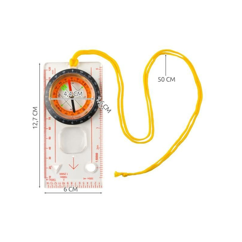 Kompas je vybavený lupou, ktorá umožňuje presné čítanie aj počas túry.Otvory v tvare kruhu a trojuholníka vám umožňujú kresliť symboly na mapu ceruzkou.