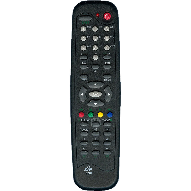 Diaľkové ovládanie typu ZIP pre satelitné zariadenia s podporou základných funkcií televízora.
