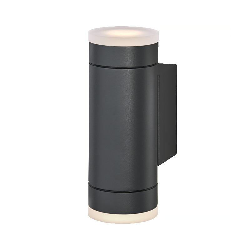 Vonkajšie kovové nástenné svietidlo, nepriame osvetlenie obojstranné, bez senzora ‒ pre päticu: 2x GU10 • výkon: 2x LED 7 W max. • napätie: 220-240V • ochrana: IP65 • materiál: hliník+PMMA • farba: tmavosivá • rozmer: 17,6x6,5x10 cm