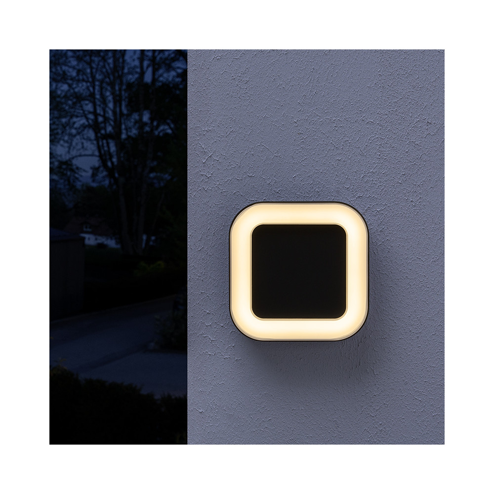 Vonkajšie nástenné LED svietidlo, zaoblené štvorcové ‒ výkon: 13,5 W • svetelný tok: 1450 lm • farba svetla: teplá biela (3000K) • ochrana: IP44 • materiál: hliník+PC • farba: tmavosivá • rozmer: 20x20 cm