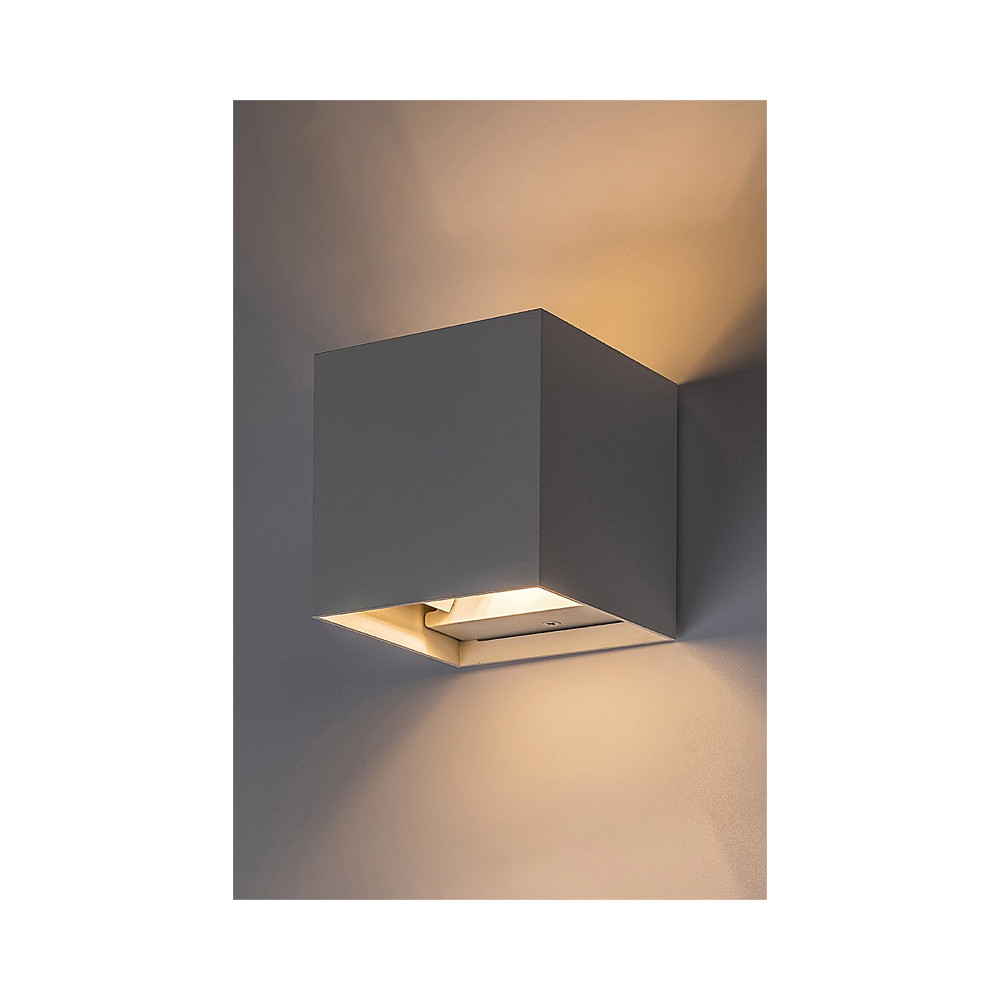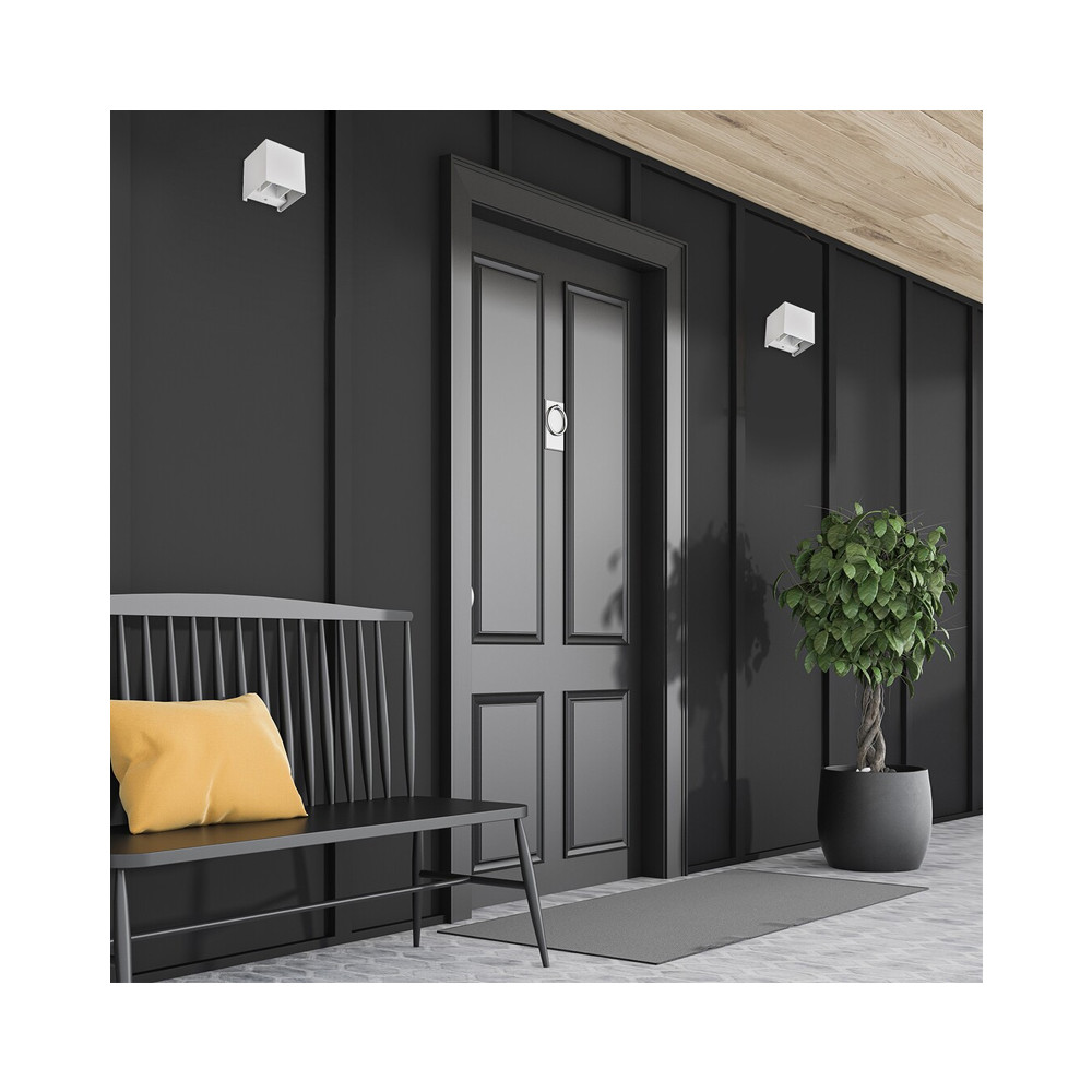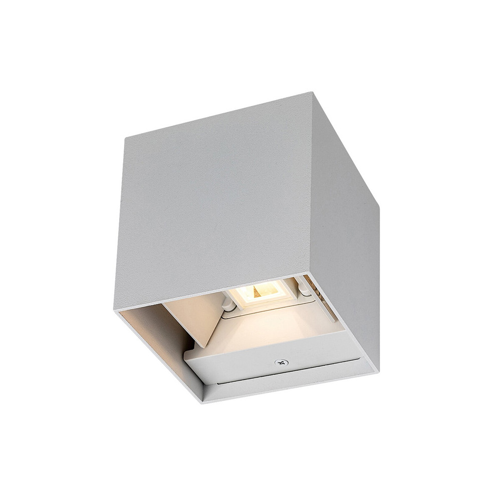 Biele vonkajšie nástenné hliníkové kubické moderné svietidlo, s nastaviteľným uhlom svietenia - pre žiarovku: 1x G9 5W max. • napätie: 230V • ochrana: IP54 • materiál: hliník, plast • rozmer: 10x10x10 cm • farba: matná biela