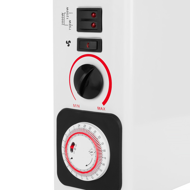 Konvektorový ohrievač - 3-stupňová regulácia výkonu 750/1250/2000W • termostat s reguláciou teploty • 24-hodinový časovač/programátor • ventilátor s funkciou Turbo Fan • držiaky pre montáž na stenu.