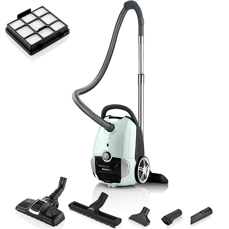 Výkonný a tichý vreckový vysávač s 4AAAA hodnotením, HEPA filtrom č. 12, 3-litrovým vreckom a 10-metrovým dosahom. Upratovanie zvládne efektívne a šetrne k podlahám.